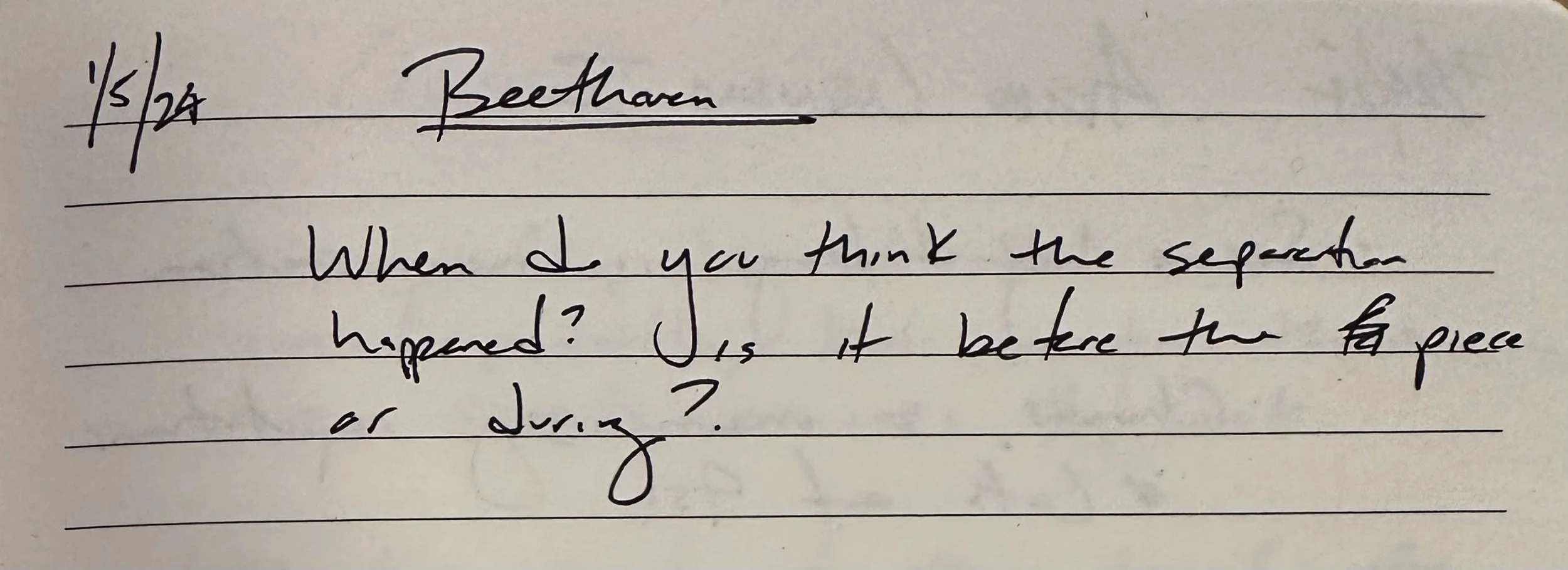 This is something I wrote to myself in my practice journal during my practice process. Obviously, someone can be literal and note that Beethoven’s influence is Archduke Rudolph and he left Vienna before the movement was composed. Blah blah blah. Boring. But as an interpreter realizing this is 2024, I LOVE thinking about this question. Perhaps the opening dirge is actually just the seeds of a separation, and not the actual act itself. But if it happens during the movement, then where does it happen? Fun to think about, even if the answer seems immediately obvious to you.